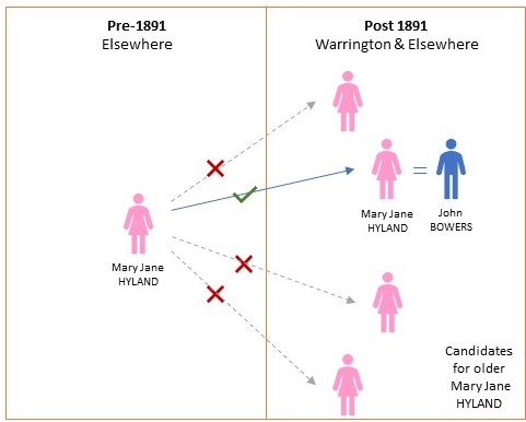 - The Mary Jane Hyland who married John Bowers in 1894 in Warrington is the only person of that name to state her father as “William Hyland (deceased)” in any records I have been able to discover.