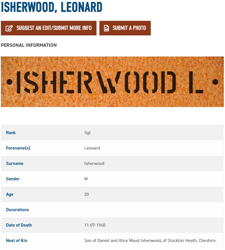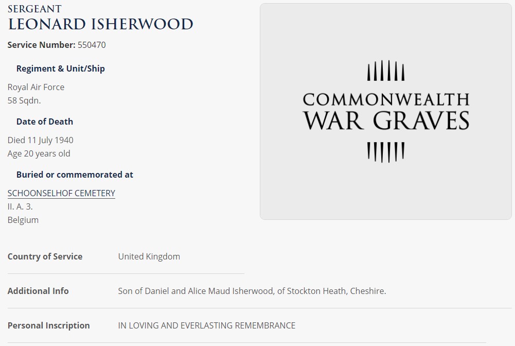 By building up the extended tree of the Isherwood family I identified the cousin of my grandfather who had served and died in the RAF: Leonard Isherwood, born in 1919 in Stockton Heath, Cheshire, a village on the outskirts of Warrington.