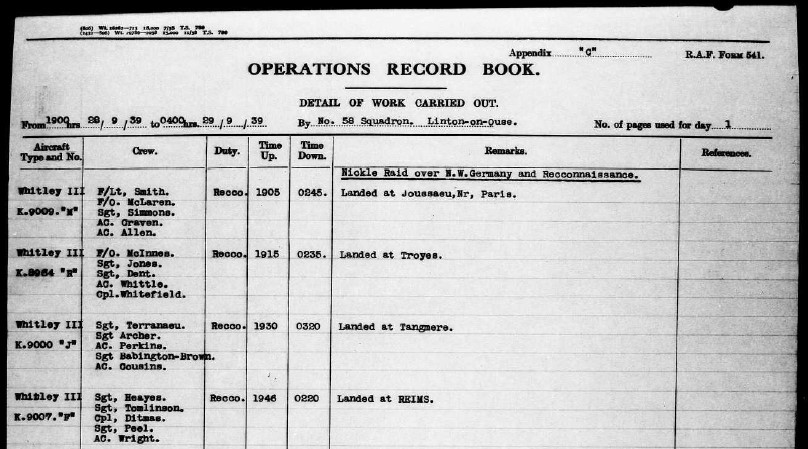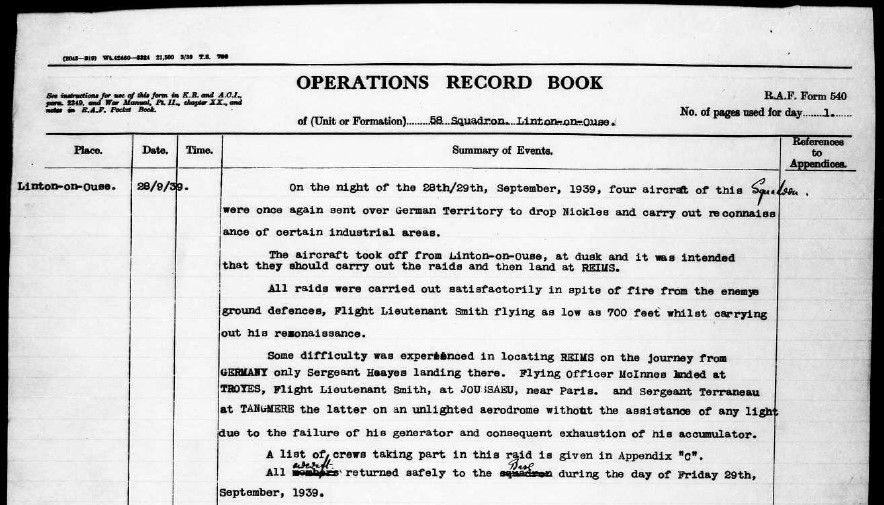 The ORBs for all RAF squadrons are found at TNA in class AIR 27. The records for Leonard’s unit, 58 Squadron, are in AIR 27/543. Each month generated two documents: a “Summary of Events” containing orders received and squadron level comments, and a “Record of Events” containing details of each crew despatched on an operation and brief comments on each.